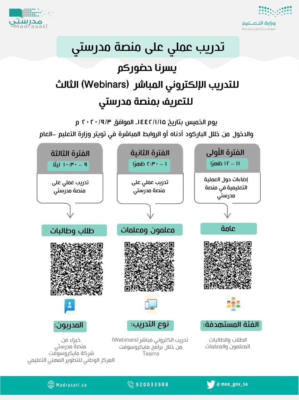 وزارة التعليم عام On Twitter يسر وزارة التعليم دعوتكم غدا الخميس لحضور التدريب الإلكتروني المباشر الثالث Webinars للتعريف بـ منصة مدرستي والدخول من خلال الباركود أو الروابط المباشرة الفترة الأولى Https T Co Ojfkr6mq0z الفترة الثاني
