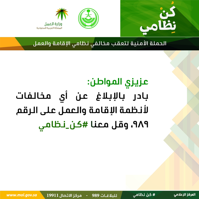 وزارة الموارد البشرية والتنمية الاجتماعية على تويتر عزيزي المواطن بادر بالإبلاغ عن أي مخالفات لأنظمة الإقامة والعمل على الرقم 989 وقل معنا كن نظامي Http T Co Vqnyjfpgpb