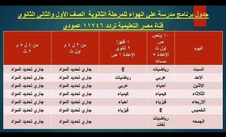 جدول برامج قناة مصر التعليمية لشرح مناهج الصف الأول والثاني الثانوي شبابيك