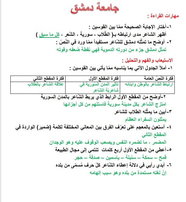 شرح وحل قصيدة يا شام في اللغة العربية للصف السابع مناهج سوريا